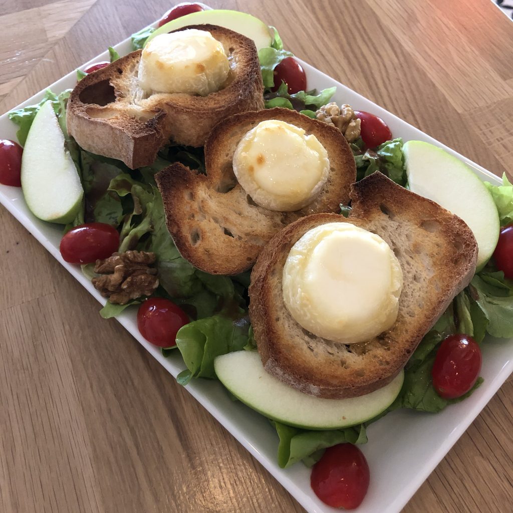 | Salade Chèvre Chaud (Salade, Toast, Chèvre, Miel, Pomme Granny, tomates cerise, Noix) |
